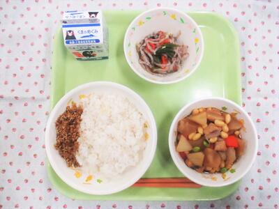 今日の献立は、麦ご飯、牛乳、いわしのおかか煮、いそ和え、里芋のみそ汁でした。