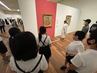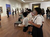 下から見上げる傘鉾は圧巻!豪華な飾りや祭りの由来などを詳しく伺うことができました。また、エントランスの展示「八代のまつり」の中には、坂本の伝統行事をみつけ、興味深く見ていました。