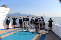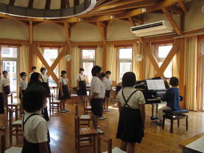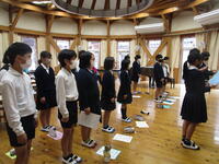 在校生代表の5年生も参加、呼びかけや合唱の動画も映され、本番さながらのリハーサルでした。