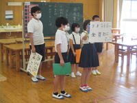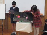 3,4年は「授業の風景」と題して、理科や社会、外国語、音楽など普段の授業の内容について発表しました。発表に使う小道具など自分たちで考えて準備し、大きな声で発表していました。