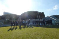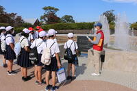 昔の道具のクイズや妙見祭について学んだ後、おいしいお弁当を食べました。近代的で美しい建物の前でパチリ。