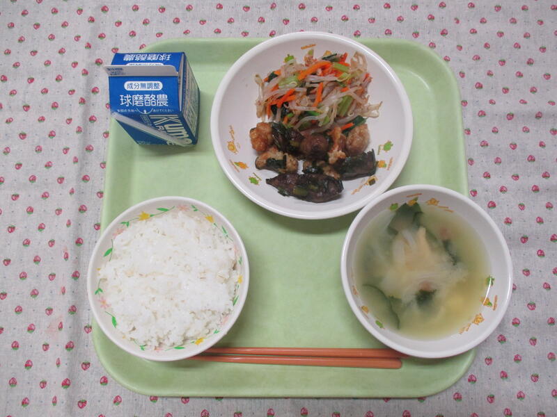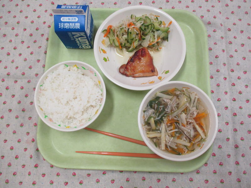 運動会の練習が追い込みに入りました。今日から子供たちが大好きなジューシーもついてきました。また、きゅうり、にんじん、もやし等のごま和えは、さっぱりしていて、練習後の食事には最適でした。今日もおいしくいただきました。