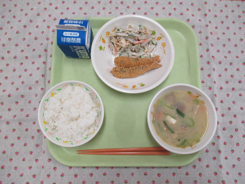 今日の献立は、麦ごはん、牛乳、魚のお茶てんぷら、みそ汁、サラたまのおかか和えでした。