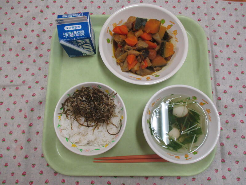 今日の献立は、麦ごはん、牛乳、かぼちゃのうま煮、すまし汁、ふりかけでした。