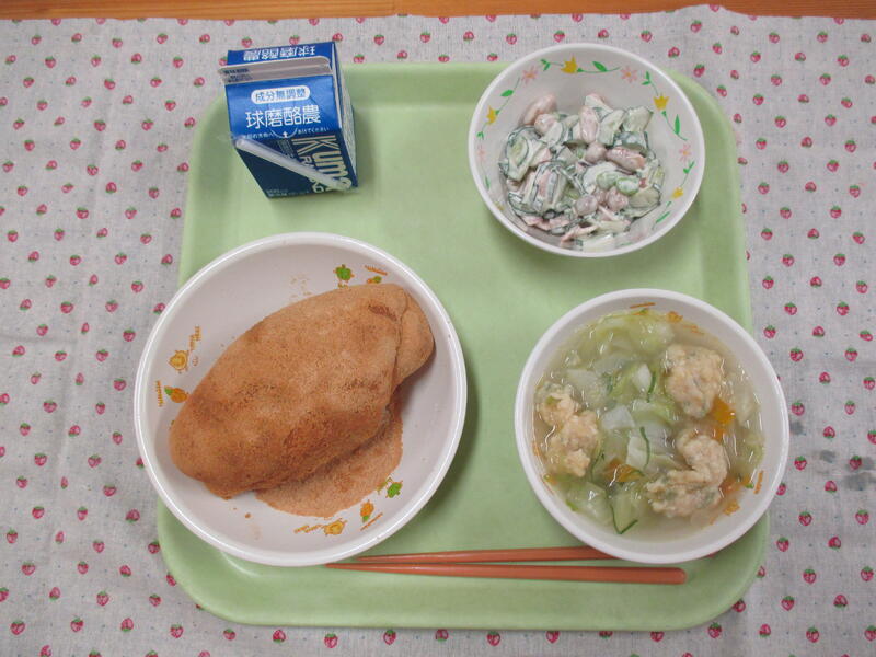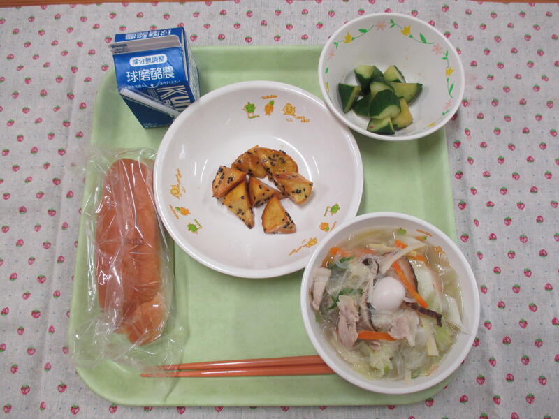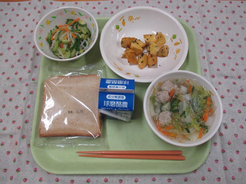 今日の献立は、黒糖パン、牛乳、肉団子のスープ、大学芋、中華サラダでした。