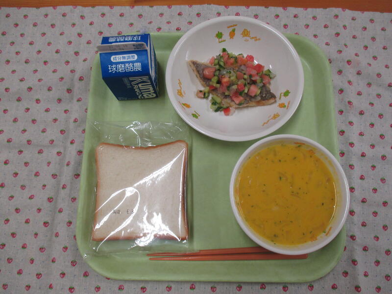 今日の献立は、コッペパン、牛乳、鶏肉のマーマレード煮、トマトと卵のスープ、大根サラダでした。