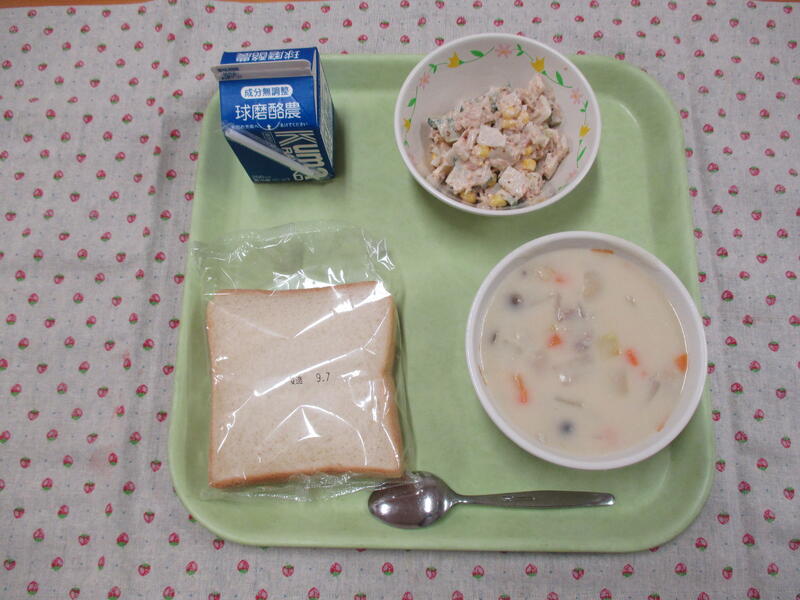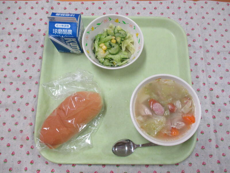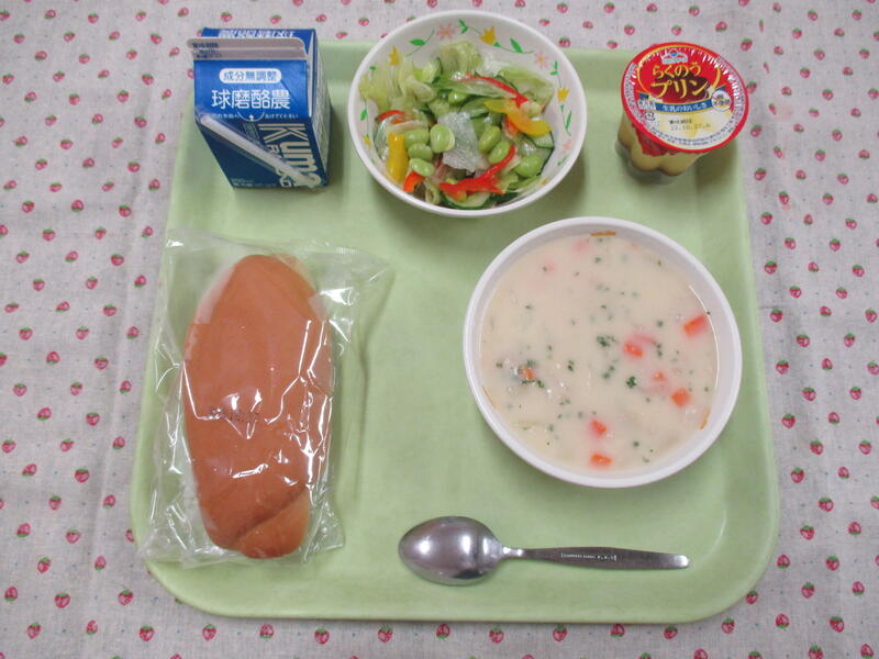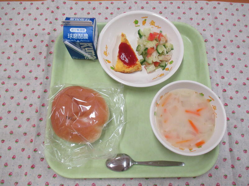 今日の献立は、チーズ蒸しパン、牛乳、ポテトのスープ、フレンチサラダでした。