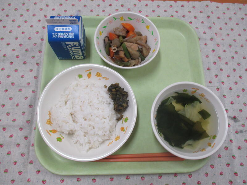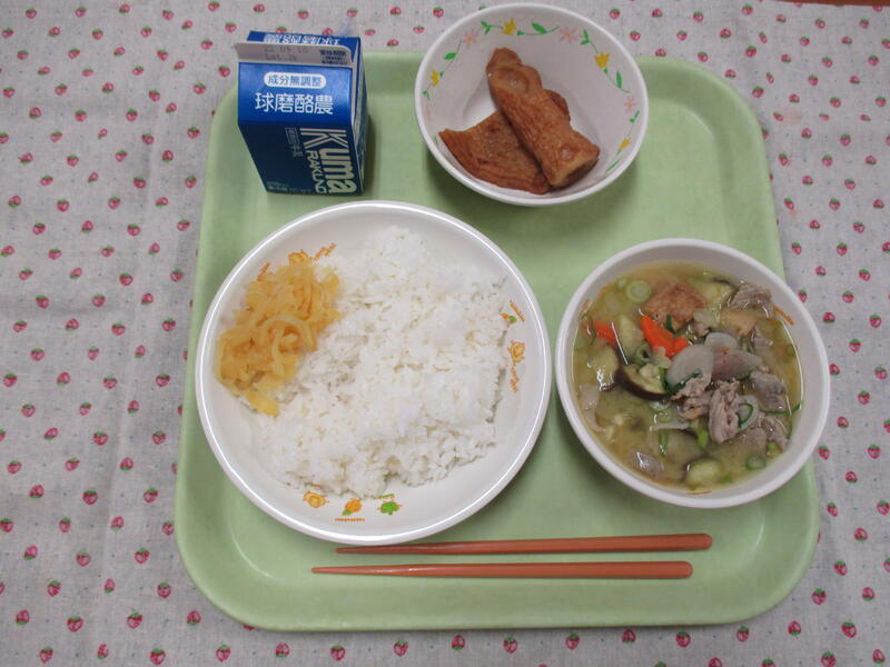 毎月19日は、食育の日として、「ふるさとくまさんデー」とされ、熊本県や八代市の食材を使った料理が出てきます。今日は、みそ汁に熊本の黒皮かぼちゃと、芦北水俣で多く生産されているサラたまが使われています。今日もおいしくいただきました。