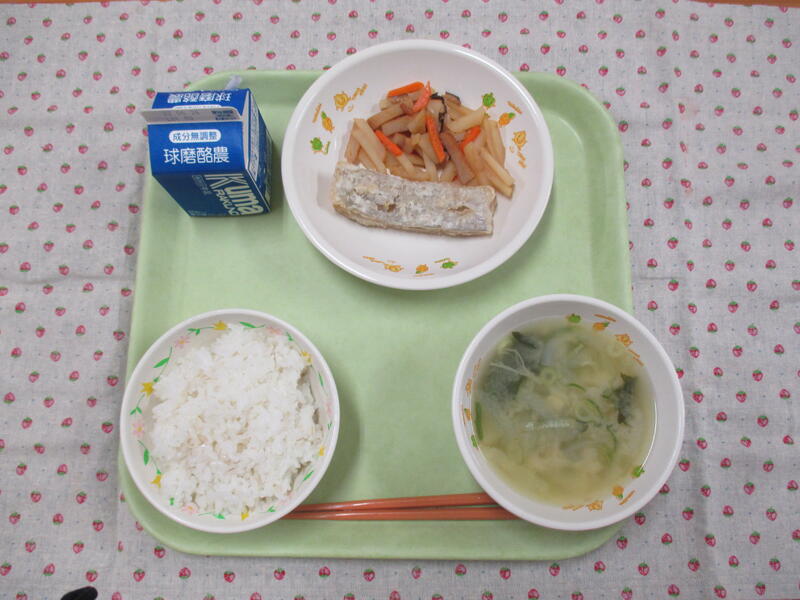 今日の献立は、麦ごはん、牛乳、いわしかぼすレモン煮、みそ汁、おかかあえでした。