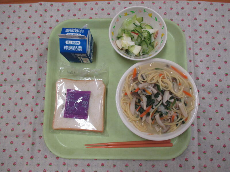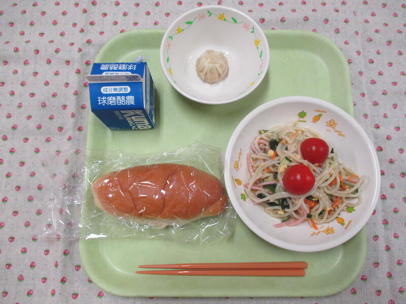 今日の献立は、ミルクパン、牛乳、春雨のタンタン麺、春巻き、きゅうりのピリ辛でした。