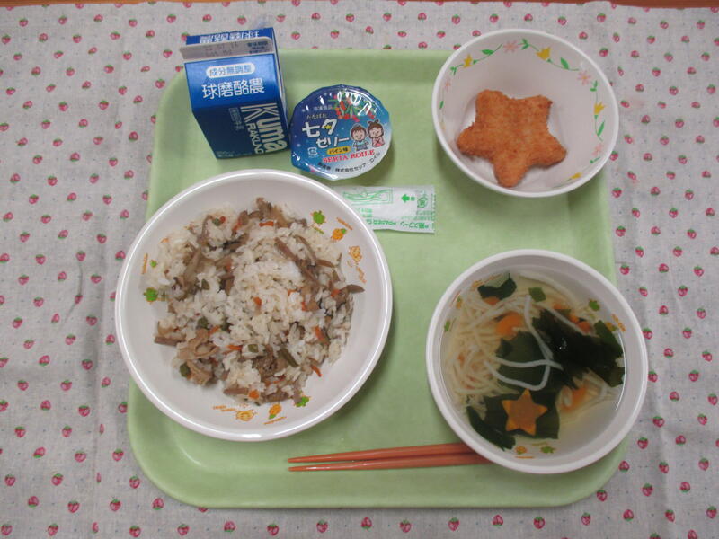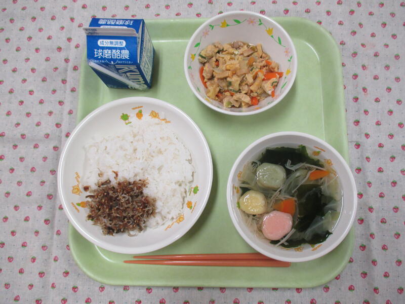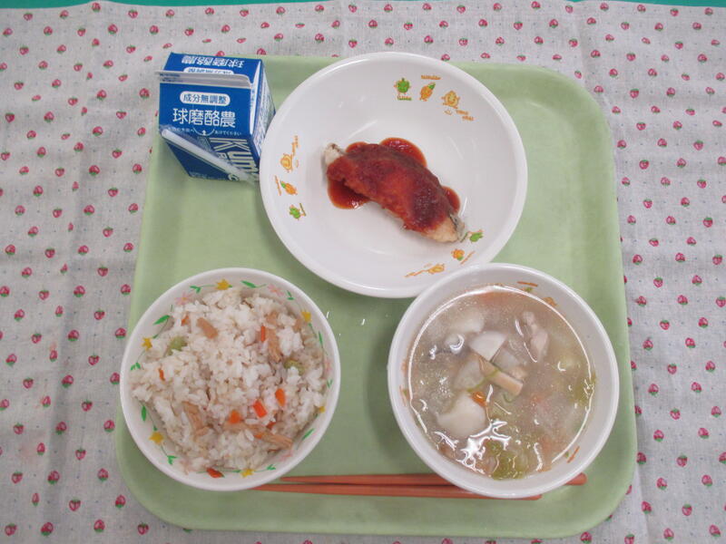 今日の献立は、まぜごはん、牛乳、きびなごのしょうがたれ、すまし汁でした。