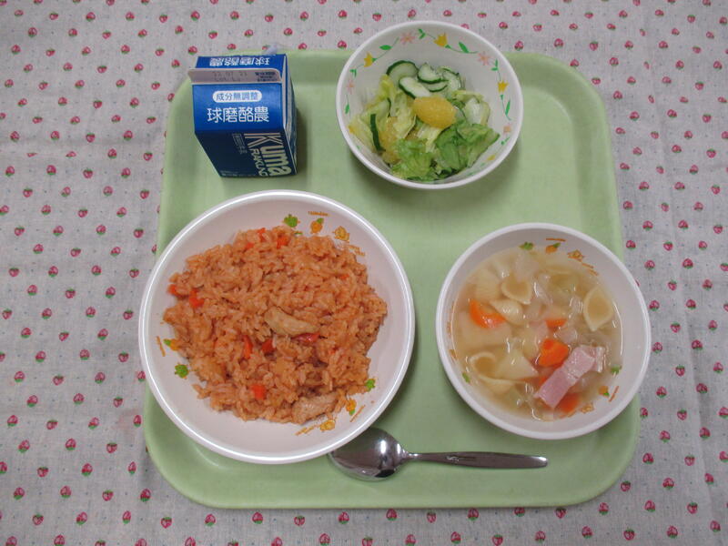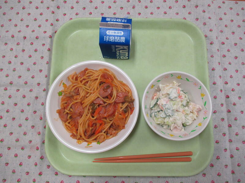 今日は、洋食メニューの代表スパゲティがメインで、細かく刻んだ野菜とミンチがよく絡んで、八代特産のトマトで作ったトマトケチャップが味をまとめてくれていまし。さらに、ヨーグルト和えが口直しに、さっぱりとさせてくれました。とてもおいしかったです。