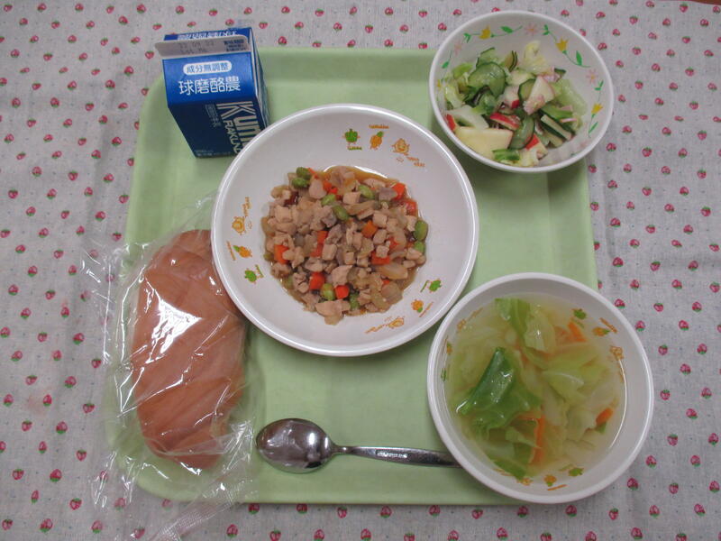 今日の献立は、ミルクパン、牛乳、白菜スープ、鶏肉のトマトソース煮でした。