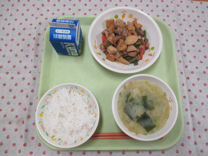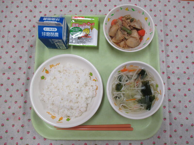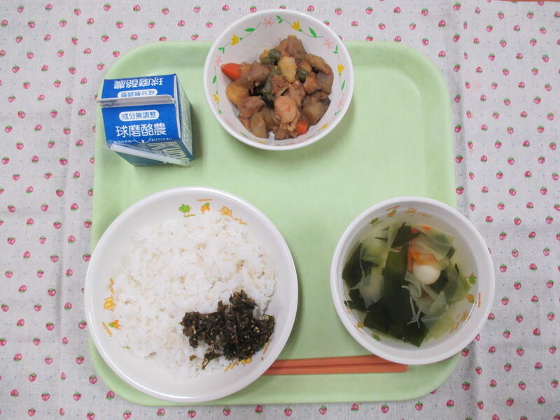 今日は、和食料理の定番、肉じゃがでした。しかもカレー味で、授業中、カレーの香りが給食室から漂っていました。じゃがいもの柔らかく、ほくほくで、白ごはんが進みました。今日もおいしくいただきました。