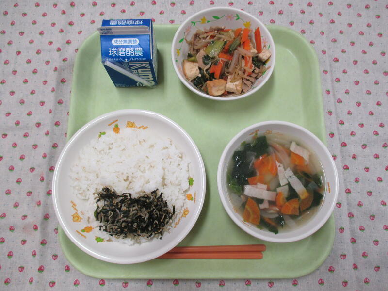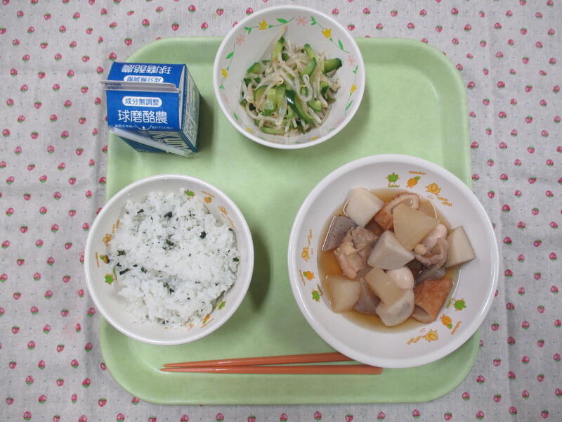 今日の献立は、わかめごはん、牛乳、おでん、野菜のピリ辛でした。