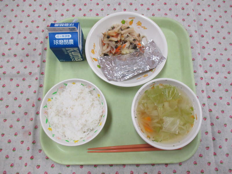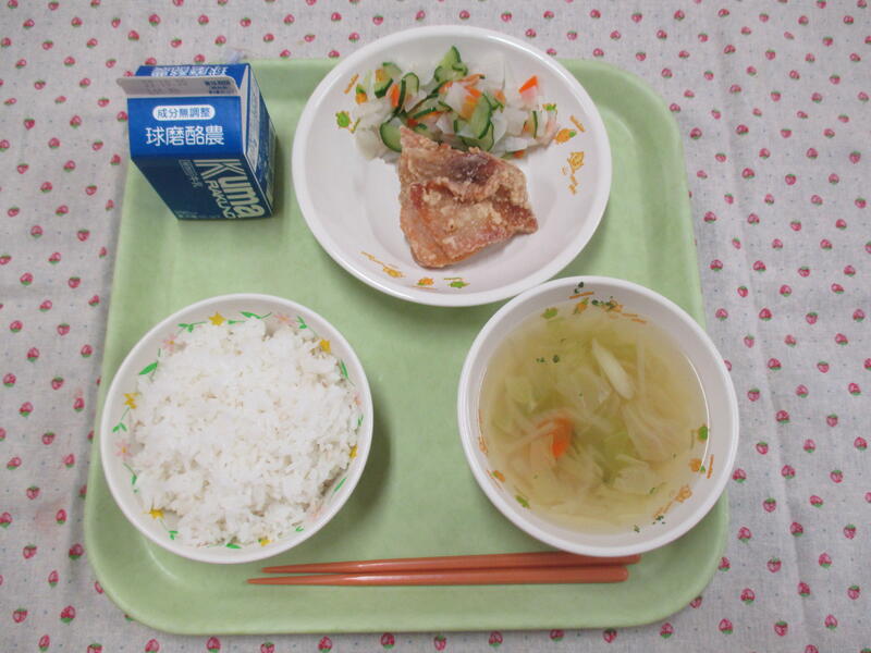 今日は、ふるさとくまさんデーということで、地元の白菜がスープに使われました。この季節に白菜は漬物、鍋物など多くの料理に使われます。今日も白菜と春雨たっぷりの温かいスープでした。今日もおいしくいただきました。