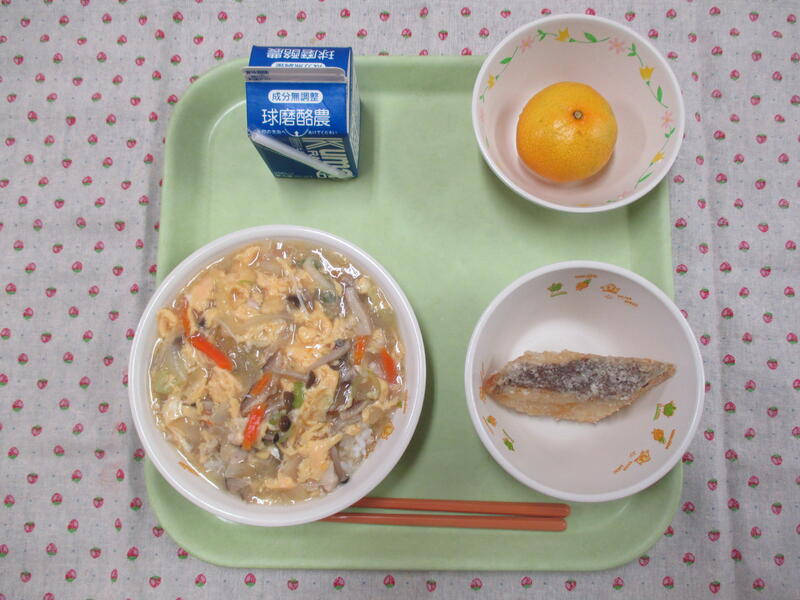 今日の献立は、南関あげ丼、牛乳、すまし汁、もやしのおかか和えでした。