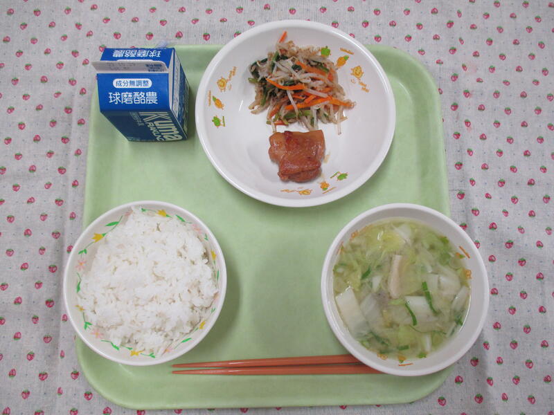今日の献立は、麦ごはん、牛乳、ちくわの磯辺揚げ、みそ汁、ごま和え、ジューシーでした。