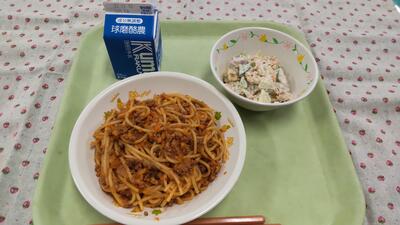 今日の献立は、黒糖パン、牛乳、スパゲティ・ボロネーゼ、ヨーグルト和えでした。
