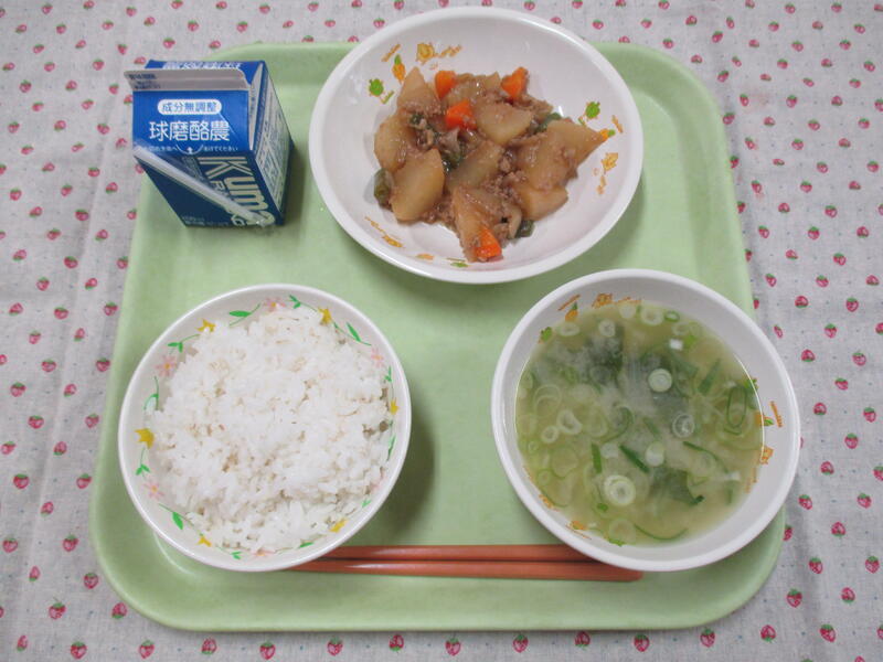 今日の献立は、麦ごはん、牛乳、肉じゃが、みそ汁、ふりかけ(のりたまご)でした。