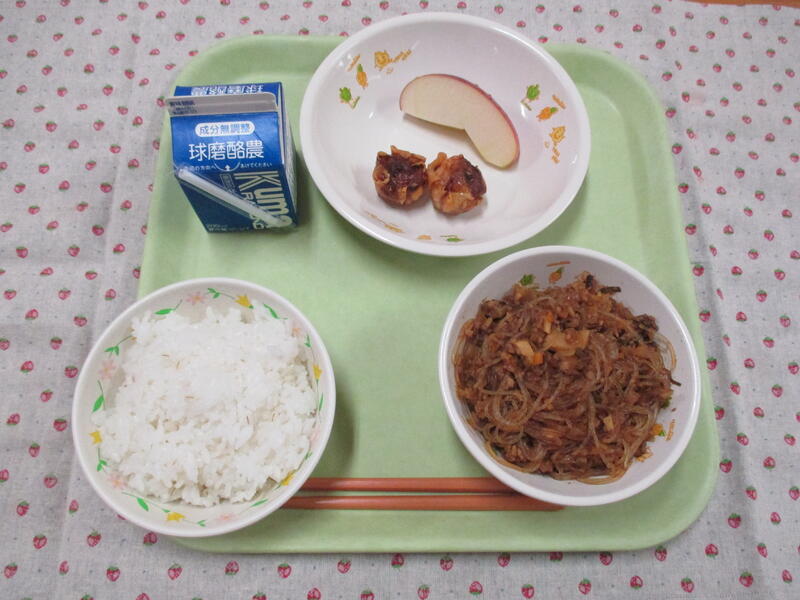今日は、ひじきがたっぷりのひじきごはんでした。ひじきには、丈夫な骨や歯をつくるカルシウムや血をつくるもとになる鉄分が多く含まれています。しっかり食べて丈夫な八竜っ子になります。今日もおいしくいただきました。