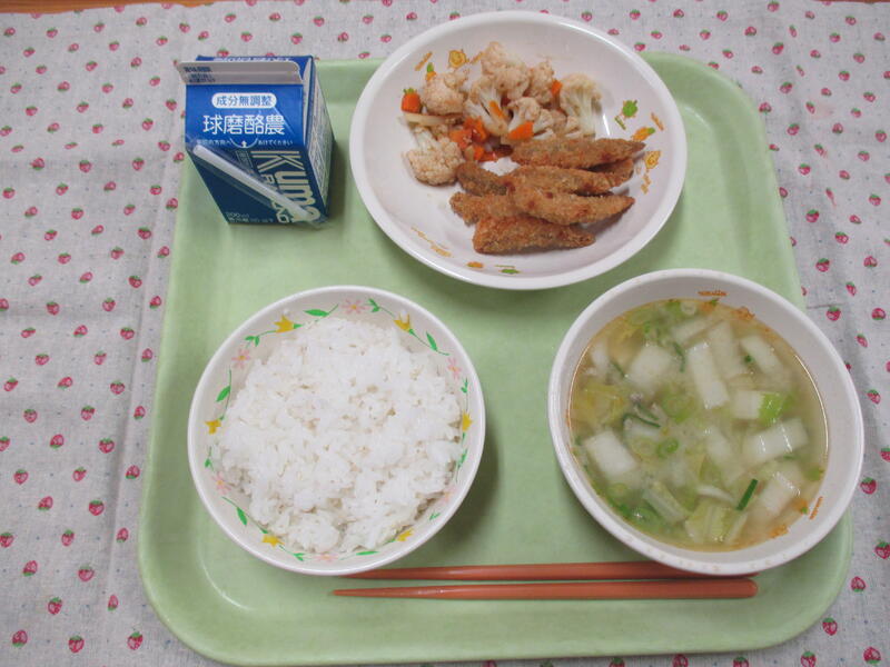 今日の献立は、麦ごはん、牛乳、魚のサラたまソースかけ、わかたけ汁、春キャベツのマヨネーズ和えでした。