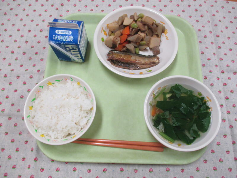 昨日(11月24日)は、「いい日本食」和食に日に制定されています。日本の伝統的な食文化について見直し、和食の良さについても考えてみるといいですね。今日は、秋の味覚たっぷりのまぜごはんに、きびなごのしょうがたれもついて、食が進みました。今日もおいしくいただきました。