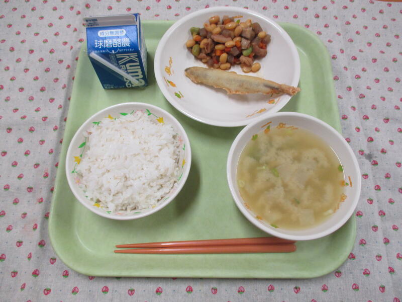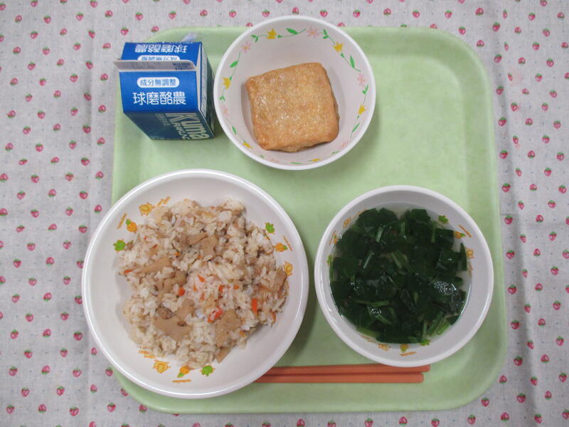今日の献立は、たけのこご飯、牛乳、きびなごのカリカリフライ、かき卵汁、かしわもちでした。