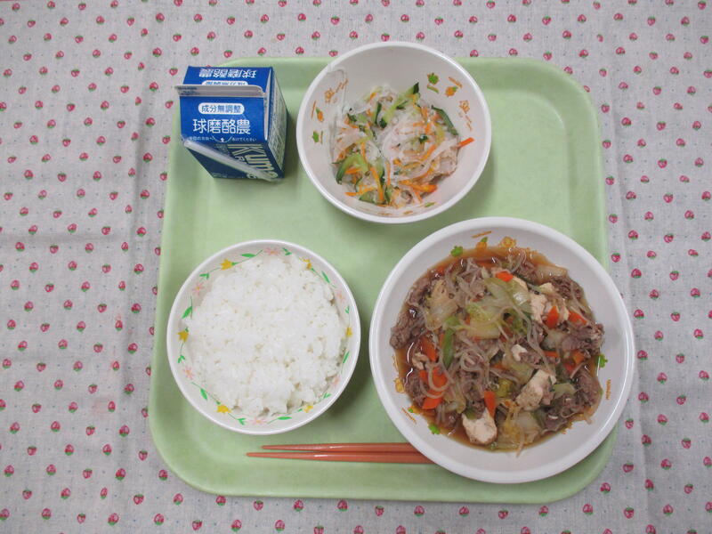 今日の献立は、麦ごはん、牛乳、すきやきうどん、三色なますでした。