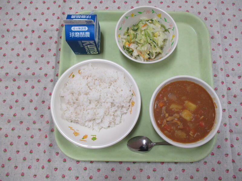 今日の献立は、ポークカレー、牛乳、グリーンサラダ、福神漬けでした。