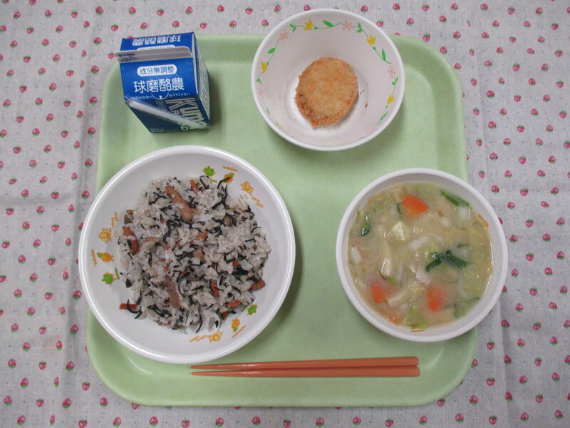 今日の献立は、ひじきごはん、牛乳、ミンチカツ、さつま汁でした。