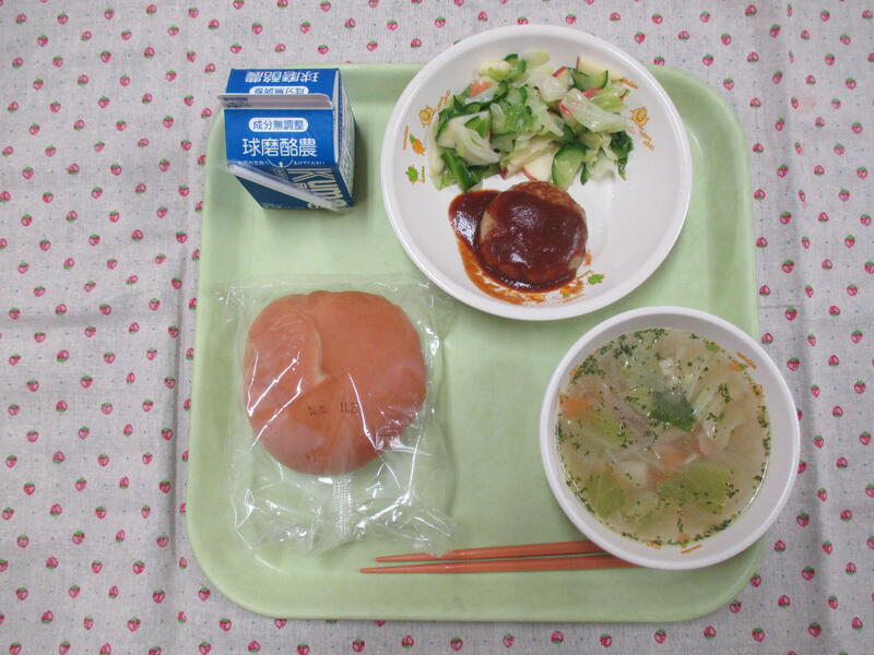 今日の献立は、丸パン、牛乳、ハンバーグ、オニオニスープ、そえ野菜でした。
