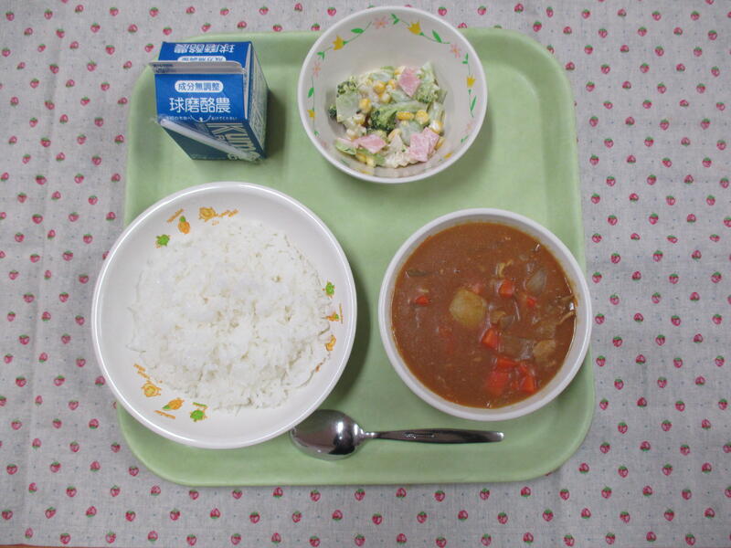 今日の献立は、ビーフカレー、牛乳、ヨーグルト和え、福神漬けでした。