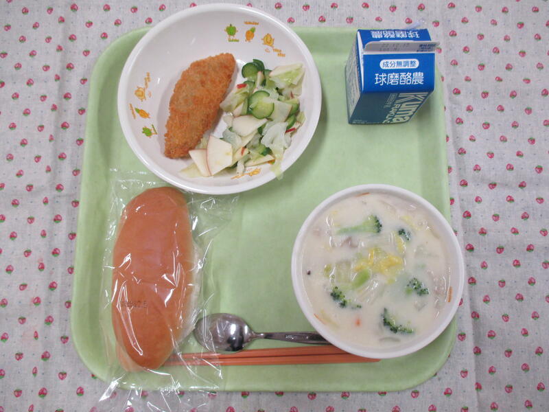 今日の献立は、コッペパン、牛乳、魚フライ、冬野菜シチュー、フレンチサラダでした。