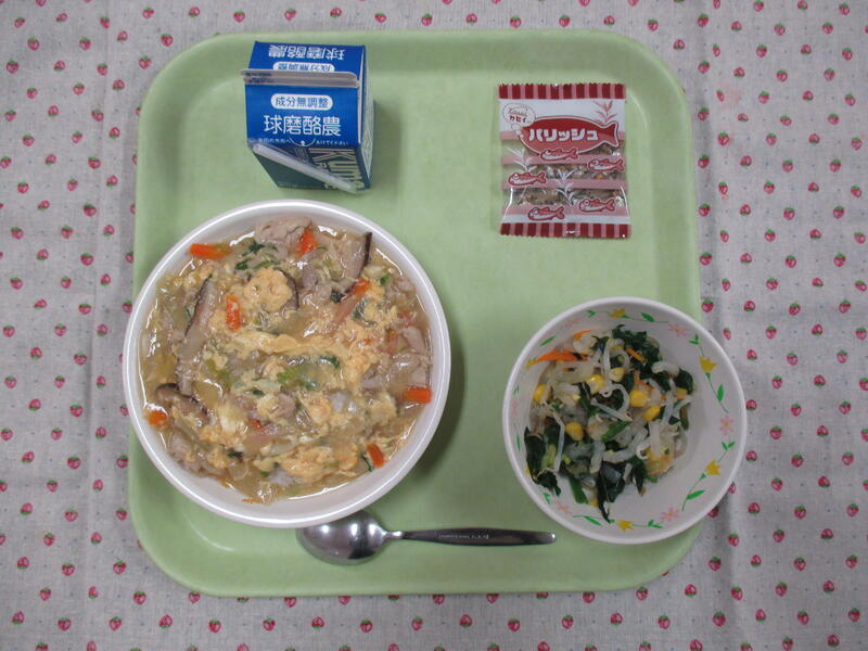 今日の献立は、親子丼、牛乳、五色和え、パリッシュでした。