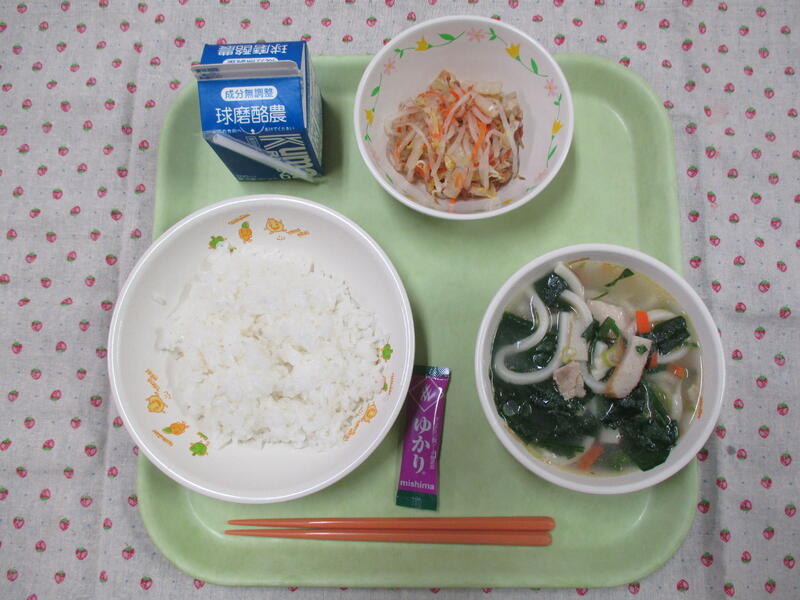 今日の献立は、麦ごはん、牛乳、五目うどん、おかか和え、一食ゆかりでした。