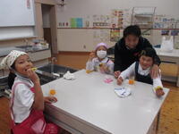 さらに、飲み物は、担任の先生の自宅で収穫された「みかん」を使って「フレッシュオレンジジュース」でした。