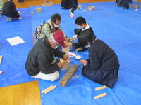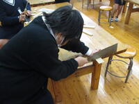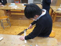 担任田浦先生から、安全面の指導を受け、早速ノコギリを使って木材をカットしていました。図工室には本当に「ギコギコ」の音だけが響くくらい、みんな集中して取り組んでいました。