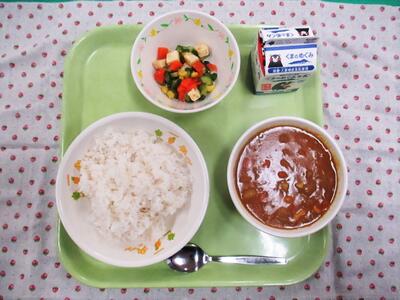 今日の献立は、チキンカレー、牛乳、豆腐サラダでした。