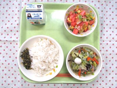 今日の献立は、【郷土料理メニュー】麦ごはん、牛乳、タイピーエン、トマトのサラダ、高菜の油炒めでした。中国福建省で生まれ熊本で育ったタイピーエン、阿蘇が有名な高菜、そして、日本一の八代産トマトと郷土をたっぷり満喫できる給食にみんな大満足(笑顔)でした。1/24からの全国学校給食週間も本日で終了。改めて、いつも給食の提供に携わっていただいている多くの皆様に感謝の気持ちをお伝えします。「ごちそうさまでした。」