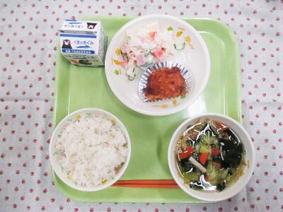 今日の献立は、麦ご飯、牛乳、鶏肉のみそマヨネーズ焼き、わかめの酢の物、さつま汁でした。