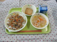 こぎつねご飯、牛乳、魚そうめん汁、がね揚げ です。