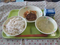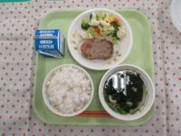 ご飯、牛乳、手作りハンバーグ、みそ汁、茎わかめのきんぴら です。