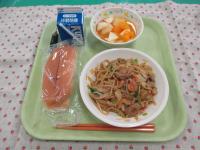 豚にら丼、牛乳、すまし汁、きゅうりの昆布和え です。