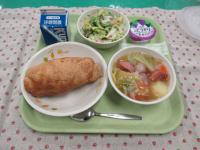 ミルクパン、牛乳、鶏のレモン風味焼き、ミネストローネ、シーザーサラダ、そしてスペシャルデザート「肥後グリーンメロン(詳しくはHP「学校生活」で紹介しています。)」です。