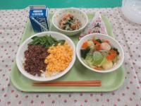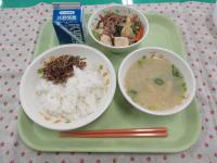 麦ご飯、牛乳、かぼちゃのそぼろ煮、かきたま汁、ふりかけ です。