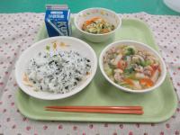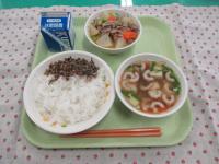 「中華ふりかけ」には「ちりめんじゃこ」が使われています。カルシウム豊富なふりかけです。中華風に味付けがしてあり、他のおかずとの相性もバッチリです。今日から10月。美味しい給食を食べて気持ちも新たにがんばります。