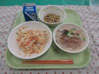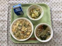 今日の献立は、親子丼、牛乳、ビーフンサラダ、黒糖大豆でした。