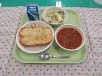 今日の献立は、麦ご飯、牛乳、照焼チキン、ミネストローネ、ポテトサラダでした。