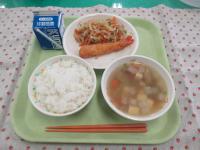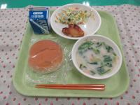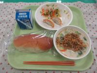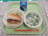 米粉パン、牛乳、鶏肉の香味だれ、かきたまスープ、こんにゃくサラダ です。